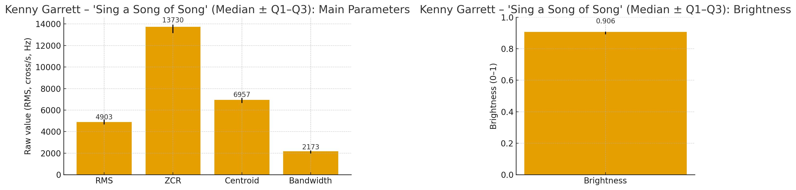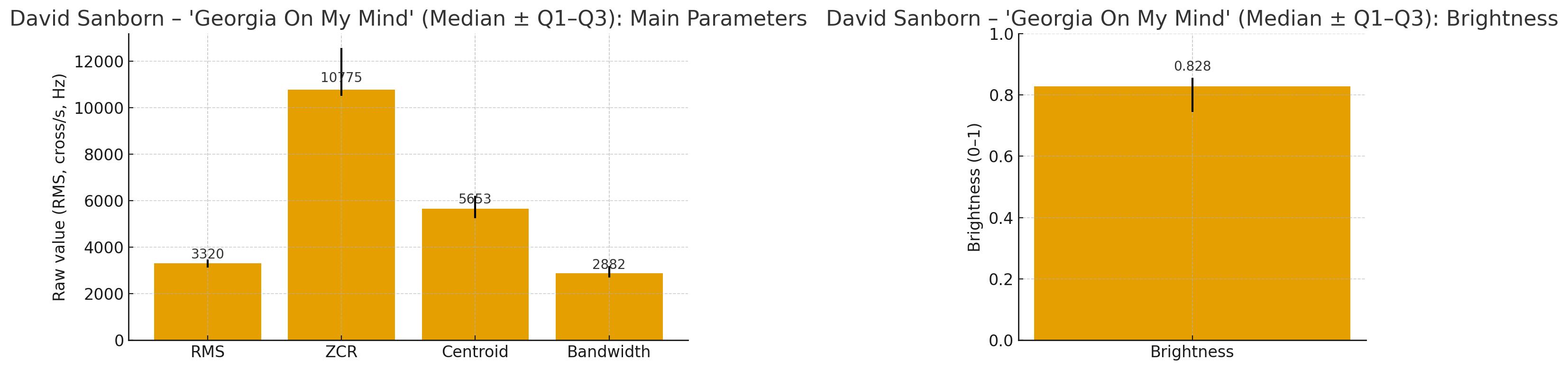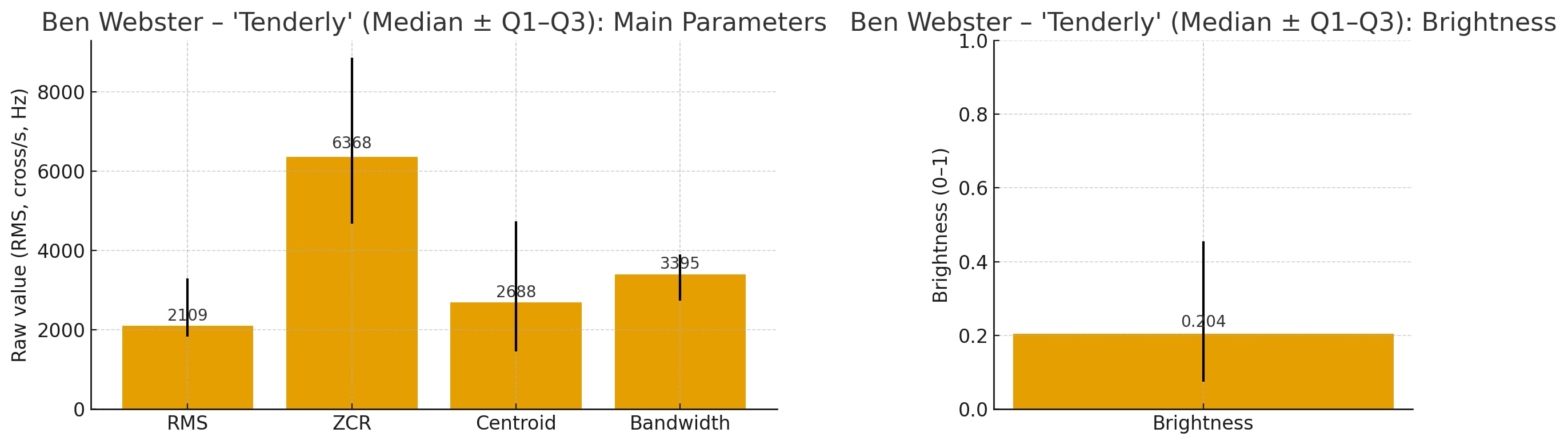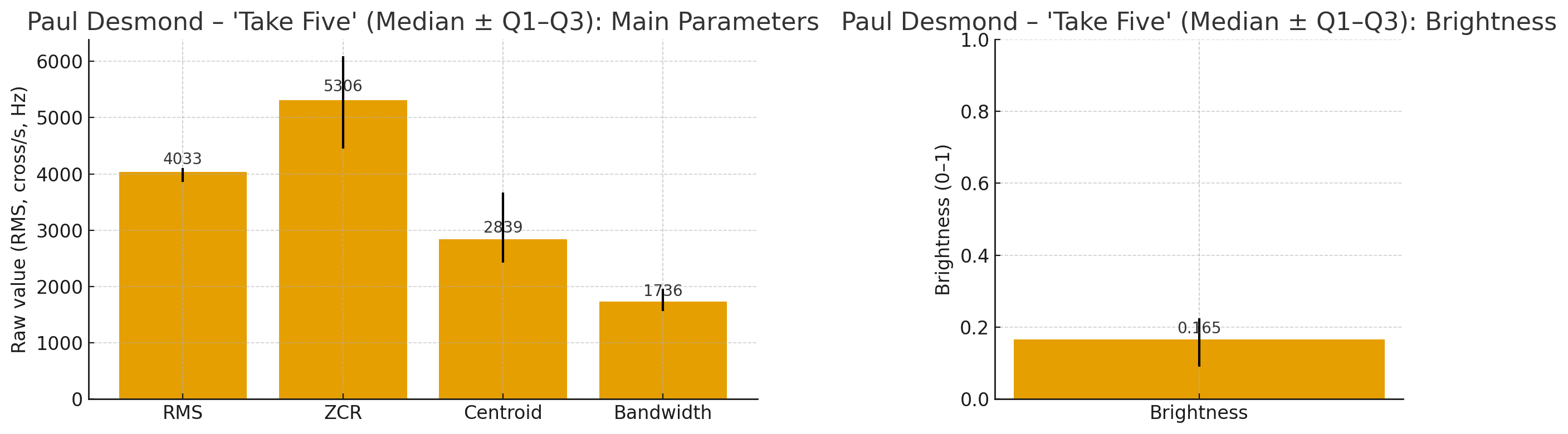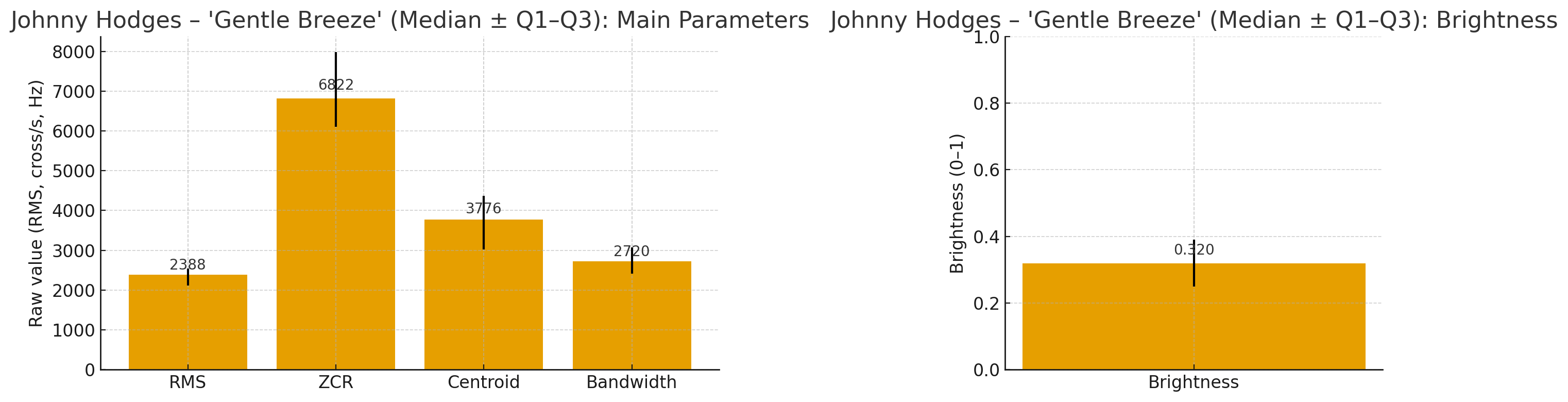 #Extracted 8–10 representative segments from the performance and analyzed them with ToneDex, focusing on key tone parameters: RMS, ZCR, Spectral Centroid, Bandwidth, and Brightness.